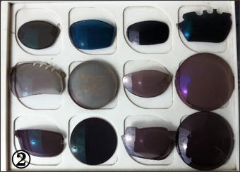 テストレンズは上段左より、【偏光グレー】、【染色カラーレンズ】、【ポリカーボネイトカラーレンズ】、【NXTカラーレンズ】
